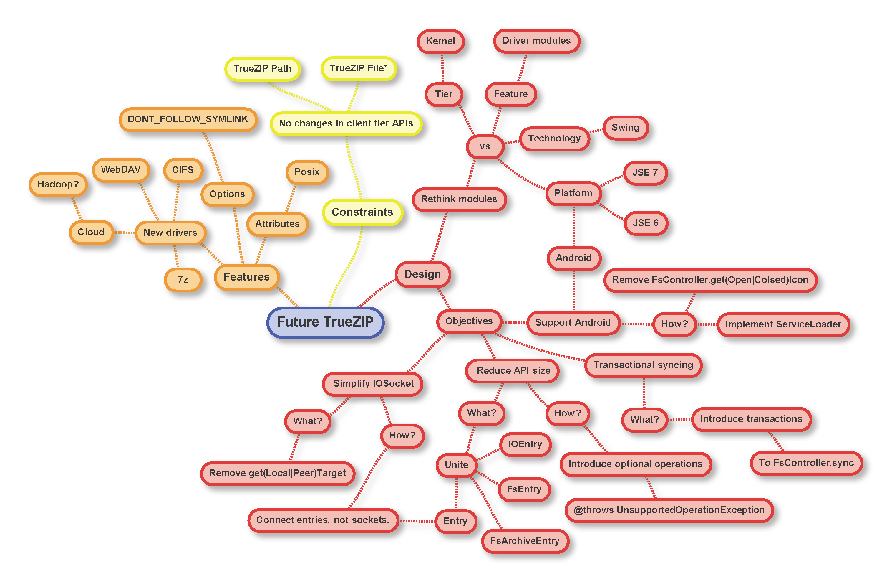So after releasing TrueZIP 7.3.1 I thought it was time again to think about future TrueZIP using a mind map. This time however, I’ld like to share my mind map with you.